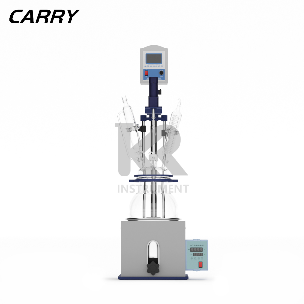 1L單層玻璃反應釜具有電動恒速攪拌系統、冷凝、滴加系統、加熱浴鍋。在攪拌...
